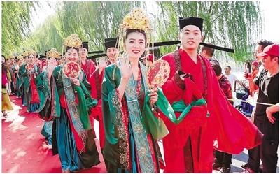 중국 전역의100개 역사 문화 명도시에서 온 커플 백 쌍이 최근에 화려한 중국 전통 혼례복을 곱게 차려 입고 항저우 시후(西湖)호숫가에서 인연을 맺었다.