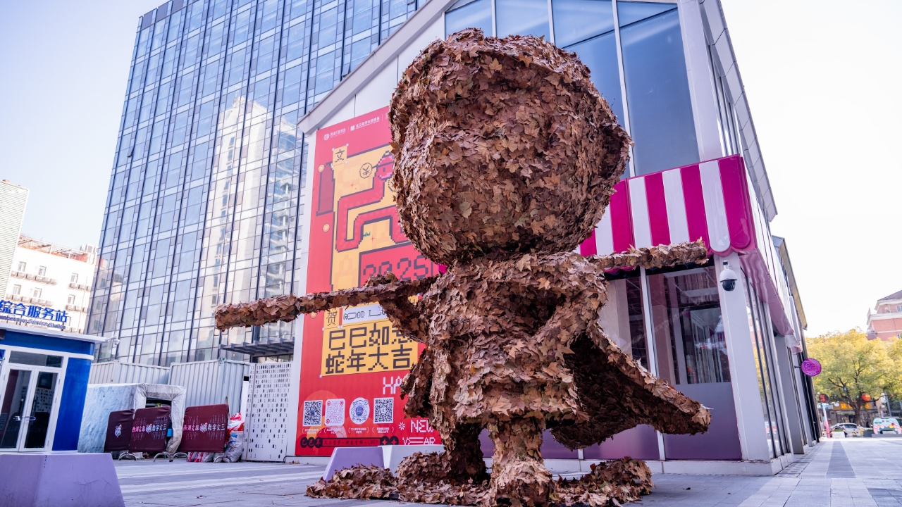 15일 중국산 3A게임 '검은 신화: 오공(悟空)'에서 영감을 받은 높이 5m의 가을 낙엽 예술 설치물이 항저우 뭔산(文三) 디지털 라이프 디스트릭트에서 등장해 관광객들의 발길을 사로잡았다.