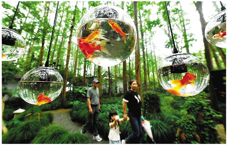 최근취위안펑허(曲院風荷, 곡원풍하 서호10경 중 하나)공원의 메타세쿼이아 숲 속에 있는 한 레스토랑은 야외에서 크기가 다른 유리 어항 20여 개를 설치했다.맑은어항을들여다보면어항속의작고붉은잉어들이마치수림사이에서노닐듯이보여서지나가는관광객들의발걸음을멈추게하면서핫플레이스가되었다.