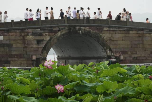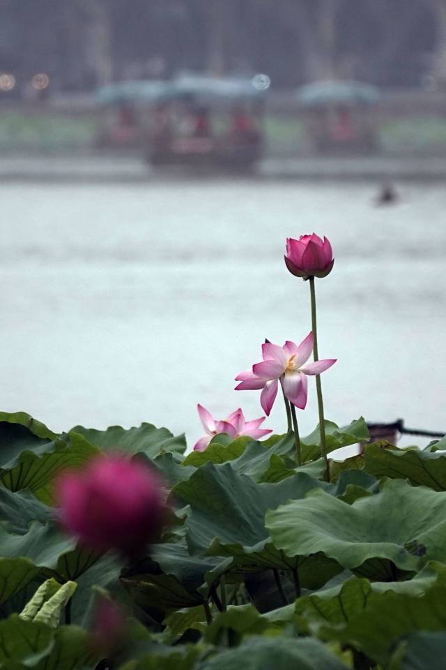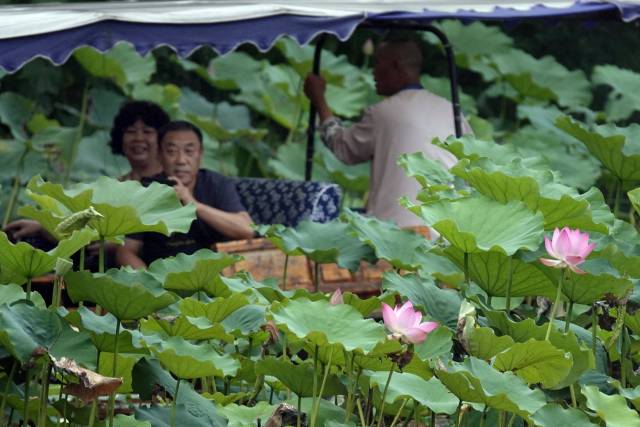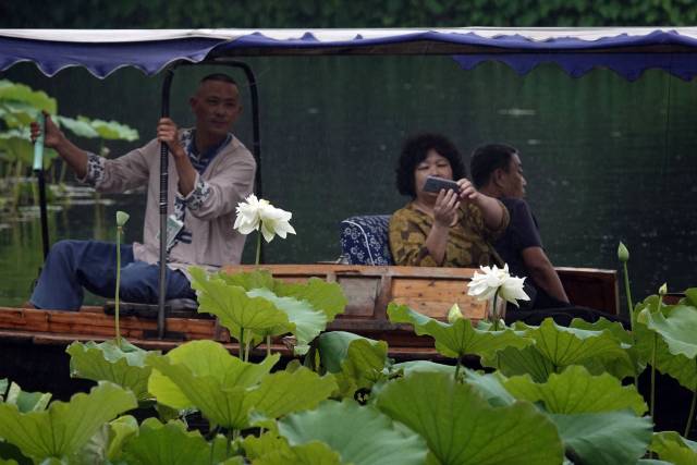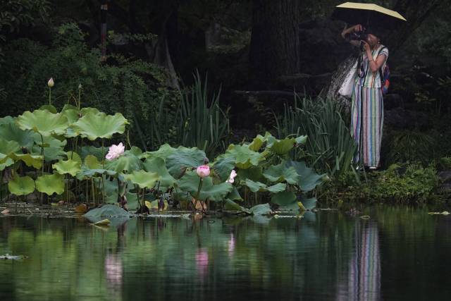 지난9일 시민과 관광객들이 가랑비 속에서 항저우 시후(西湖)의 각양각색 연꽃을 감상했다.